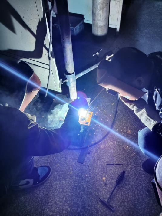 党员薛敬文同志作为焊接专业教师,带领焊接加工专业学生组成“焊接修复组”。他首先向学生演示电焊机操作规范与安全注意事项,随后手持焊枪精准对准开裂部位进行焊接作业。火花四溅间,他一边操作一边讲解焊接角度与电流控制技巧,学生们轮流上手实践,在实操中提升专业技能。