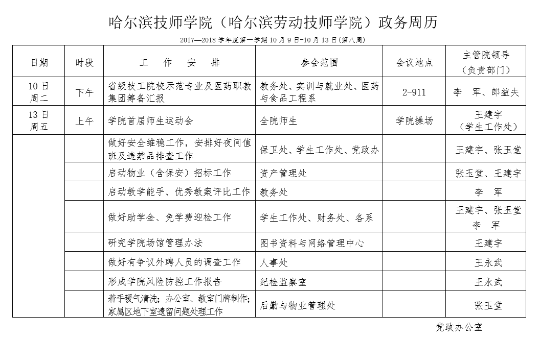 日期时段工 作 安 排范 围地 点主管院领导 (负责部门) 12日周一下午中国共产党十九大代表推荐各党支部自行安排组织人事处下午13:30学院新建项目各标段建设工作协调会总代建、总承包、监理及各工种、各施工单位负责人,基建办全体成员江北校区图书馆408室王传文副院长(基建办)下午2:00研究办公地点落位、学生宿舍落位方案有关事宜江北校区党政办公室、学生工作处等部门有关同志江北校区纪委书记室王永武...