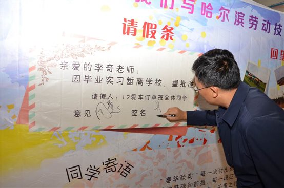 爱车班的学生特别感谢这在校的一年零一个月时光,在他们特意制作的海报前,一张从技师学院开往前程似锦站的车票格外引人注目,在他们的毕业实习请假条上,李军副院长郑重签上了自己的名字,其中蕴含着的学院的期望、师长的祝福感动着在场的每一位老师同学。锐目初映东阳起, 铁翎待博西云冲,爱车订单班学生满载着在学院的收获,奔赴自己的锦绣前程。