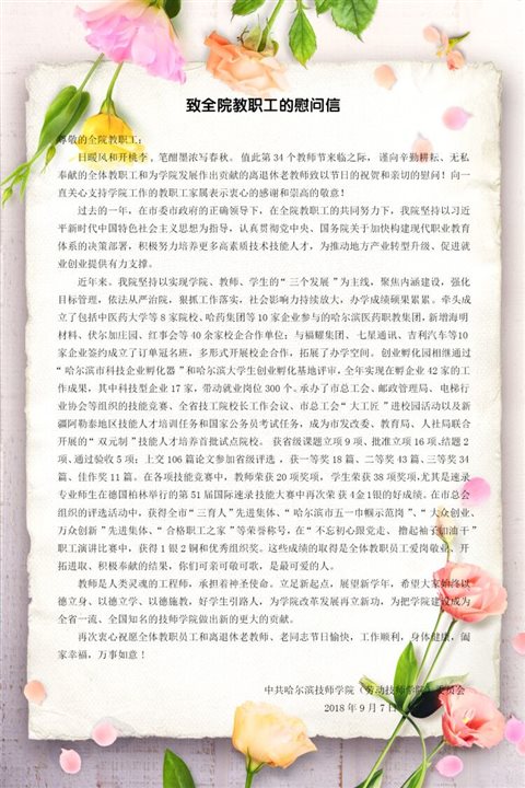 院党委高度重视这个属于教师的自己的节日,在节日来临之际,以贺信的方式向全院广大教职员工致以节日的祝福和问候。