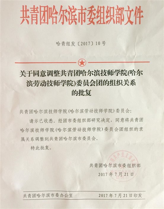 为拓宽学院青年组织活动载体,凝聚青年共识,助推青年学生发展。共青团哈尔滨技师学院(哈尔滨劳动技师学院)委员会于2017年5月26日提交纳入共青团哈尔滨市委员会申请并于同年7月21日收到共青团哈尔滨市委组织部“关于同意调整共青团哈尔滨技师学院(哈尔滨劳动技师学院)委员会团的组织关系批复”。