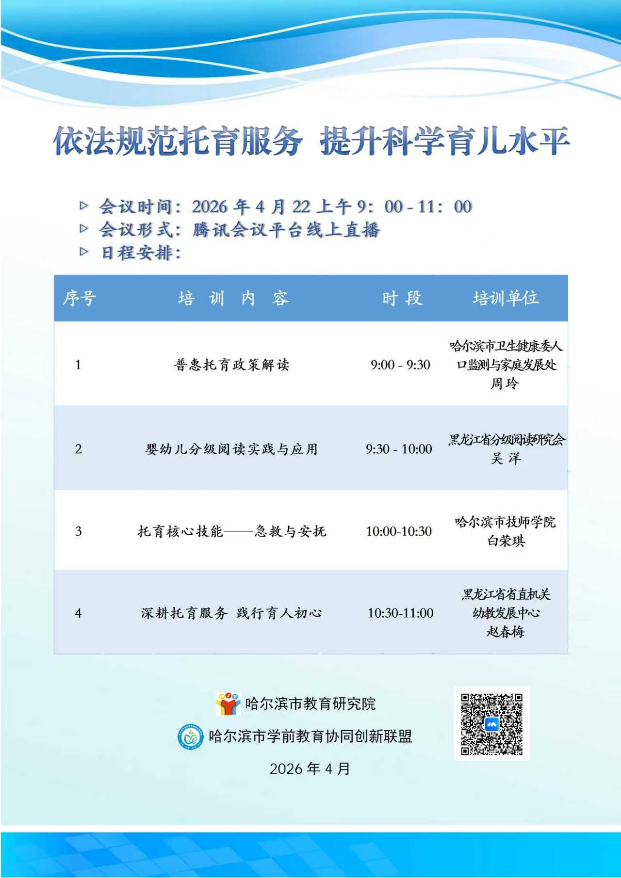 为提升哈尔滨市学前教育从业人员专业素养,推动区域托育行业规范化发展,精准对接行业人才培养需求,我院幼儿教育教研室受邀承接哈尔滨市学前教育协同创新联盟线上专项培训任务,周密部署、扎实推进各项筹备与实施工作,于4月22日顺利完成婴幼儿托育技能专题培训。学院副院长李传军、艺术设计系主任于占海、副主任刘双全程参加。