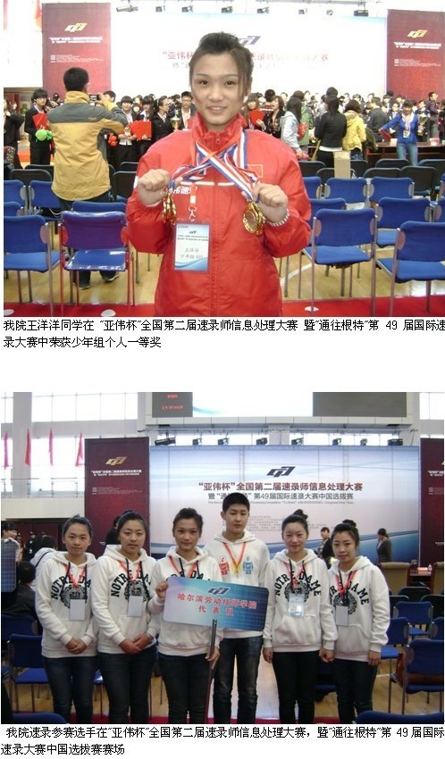 在全国第二届速录信息处理大赛暨第49届国际速录大赛选拔赛上,哈尔滨劳动技师学院速录专业学生获得包括一等奖在内的30个个人奖项一个团体一等奖的最好历史成绩。其中王洋洋同学获得“第49届国际速录大赛中国选拔赛个人一等奖”,入选为第49届国际速联比赛中国代表队成员,将于明年7月参加在比利时根特市举行的第49届国际速联大赛。哈尔滨劳动技师学院荣获“团体一等奖”,孙秀英老师荣获“优秀指导教师荣誉称号”。